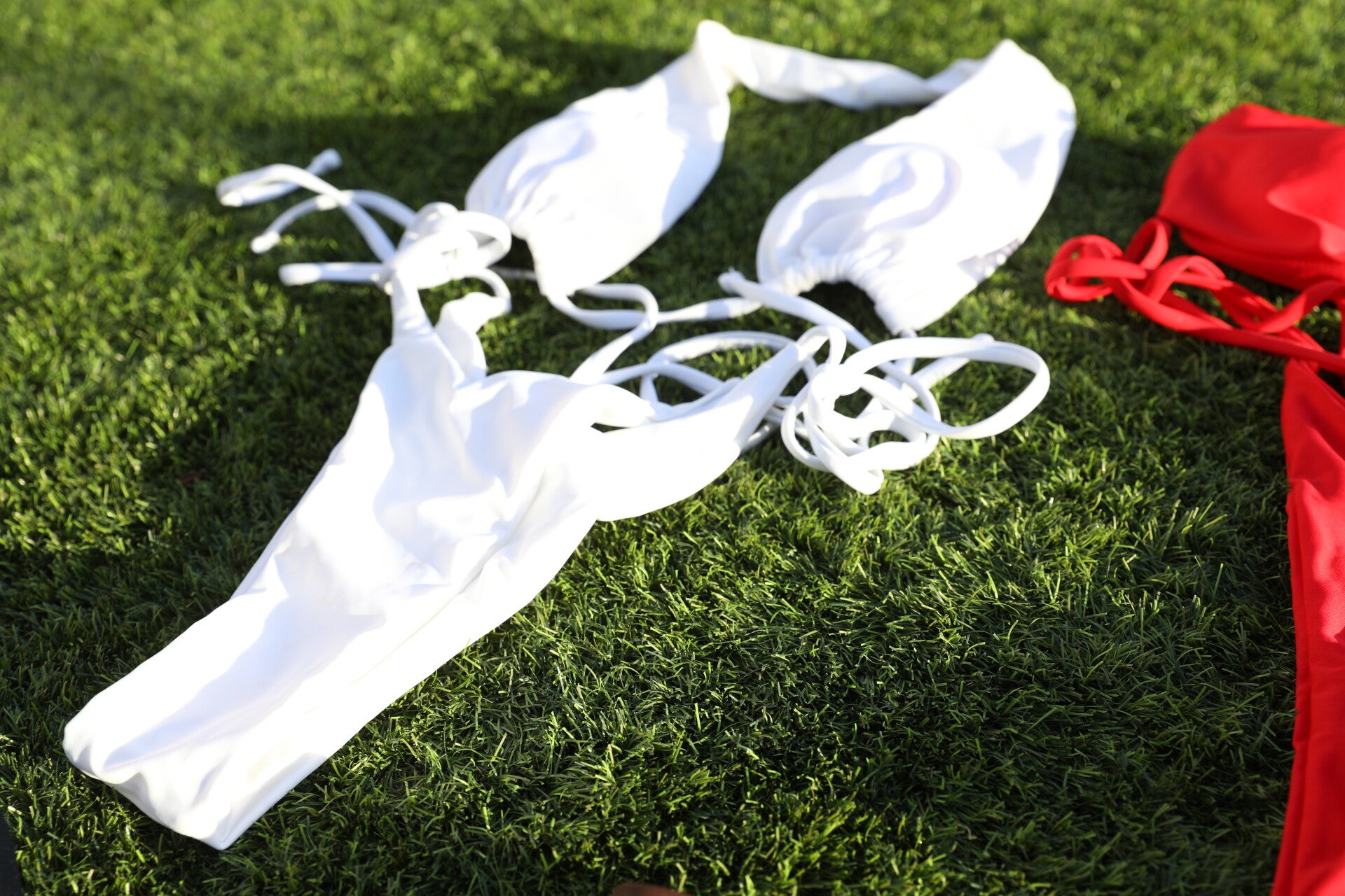 Bikini de dos piezas en color blanco, diseñado para realizar la silueta con un estilo moderno y minimalista. El top tipo bandeau cuenta con un detalle de apertura frontal y cordones ajustables, que permiten un ajuste personalizado y cómodo. La braguita de corte alto incorpora lazos laterales regulables, ideales para adaptar el fit según preferencia.