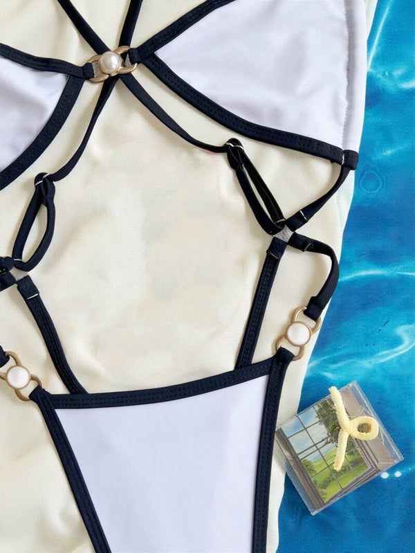 Eleva tu estilo de playa con este sofisticado bikini de diseño minimalista en contraste blanco y negro. El top tipo bandeau con tirantes finos ofrece un ajuste elegante y moderno, realzado por un delicado detalle central metálico que aporta un toque de distinción.